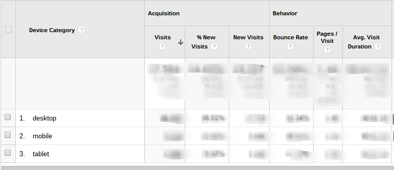 - Avg. Visit Duration:Â This one is also pretty obvious. If mobile and tablet visitors aren’t spending much time on your site, they’re not having a good experience and are unlikely to monetize well. (They’re not going to click on an ad if they don’t hang around for long.) The absolute figure here isn’t as important as the relative length compared to your desktop traffic.